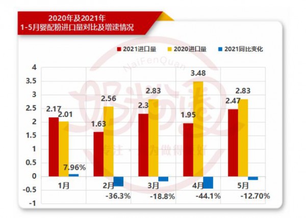 再来看看更长的时间周期。2015年到2017年,我国婴配粉进口量虽有波动,但仍保持着20%以上的较高增速。到了2018年,婴配粉进口增速明显放缓,来到10%以下,可以说这是进口婴配粉下降的第一个拐点。而面对去年疫情黑天鹅事件,2020年婴配粉进口量的降幅为3%,今年前5月的进口量同比降幅已达到23.3%。所以,如果今年下半年婴配粉进口量没有明显回升,可能预示着进口婴配粉第二个拐点的出现,负增长。