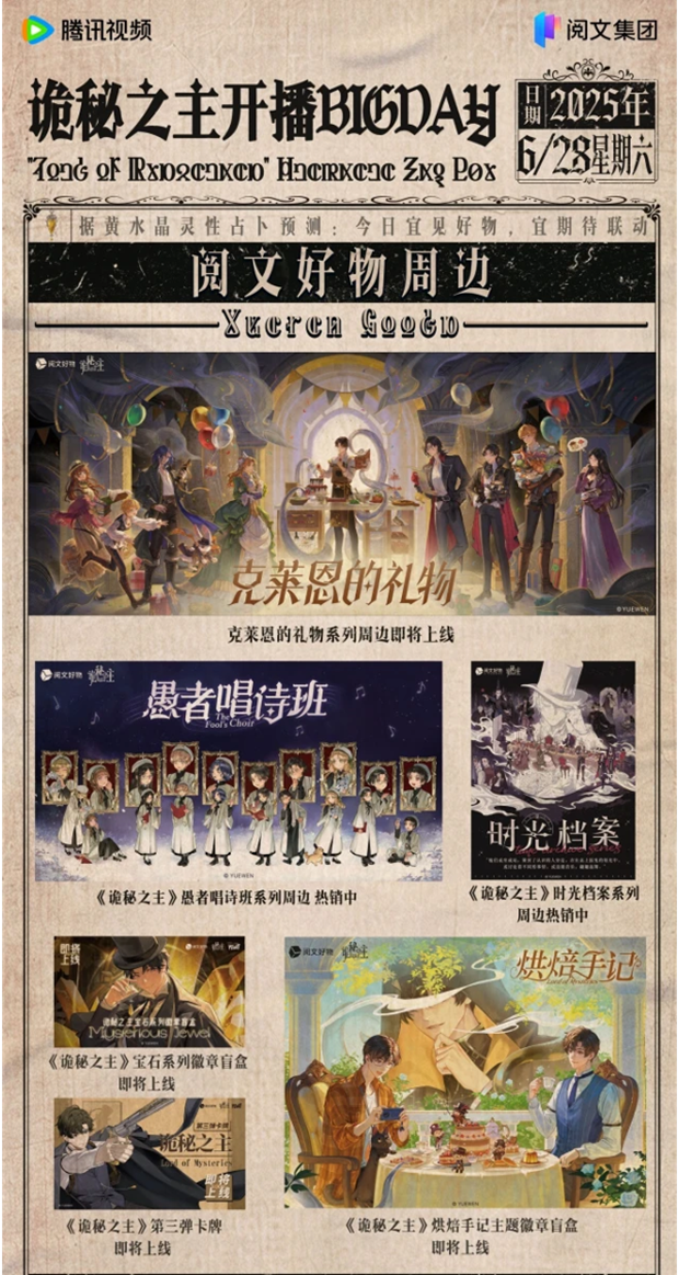 6 月 28 日,改编自超人气网络小说的《诡秘之主》动画版以中、英、日、法、韩、德、葡等七国语言在全球 190 多个国家同步播出。首播当日即登顶腾讯视频国漫榜,国际权威影视评分平台 IMDb 开分高达 9.3,创下 2025 年国产动画开分最高纪录。借势热度,阅文联动超 40 个品牌开展联名合作。此前,《诡秘之主》此前已入藏大英博物馆,其“值夜者们”主题画展与卡牌等周边衍生品在大英图书馆的首次线下亮相,吸引大量国际粉丝打卡,成为中国网文出海的标杆案例。