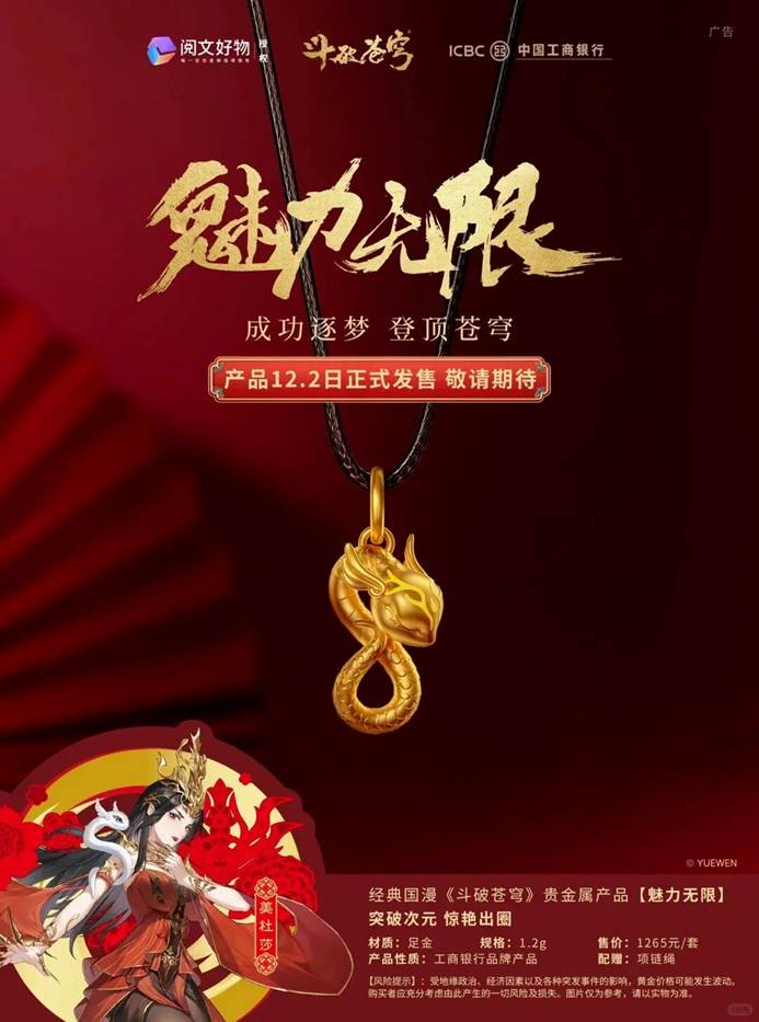 新春期间,《斗破苍穹》与中国工商银行联合推出首个国漫主题贵金属产品。此次联名产品融合IP中蛇人族美杜莎女王历经青莲地心火的淬炼,修炼幻化为七彩吞天蟒的情节。产品造型以“无限符号 ∞”和“幸运数字 8”为创意原点,寓意好运与财运无限。通过中国传统生肖元素与国漫风格的融合设计,成功实现 Z 世代消费群体的破圈覆盖。