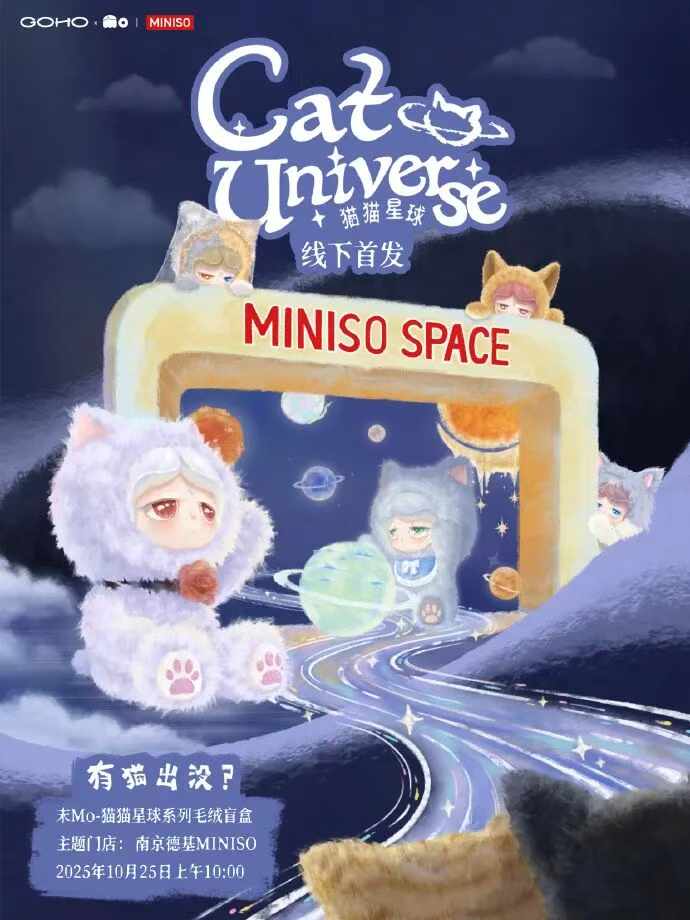 10月25日,名创优品推出 “末・猫猫星球系列毛绒盲盒”,包含水星德文、天王星英短等七大行星主题猫猫形象及 1 款隐藏款。该盲盒在 MINISO LAND 与 MINISO SPACE 线下同步首发,南京德基广场店为首发主题门店。(名创优品)