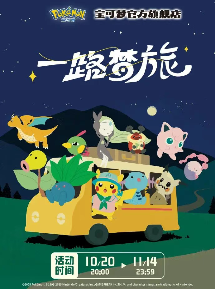 10月20日 ,Pokemon 宝可梦宣布 “一路梦旅” 主题特别活动开启。活动期间有折扣优惠和礼物赠送,同时更新购物袋款式,等身大系列毛绒玩具现货。( 宝可梦)