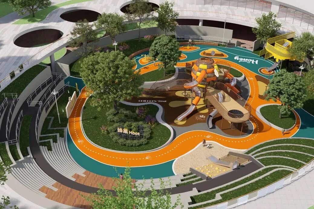 12月4日,在上海普陀,有一座刚开放的蜂巢主题儿童公园火了!橙黄主调的设施像从花丛里“搬”来的巨型蜂巢,蜿蜒的步道、错落的滑梯、藏在绿意里的互动区,让孩子一进园就秒变“小蜜蜂探险家”。(玉河设计)